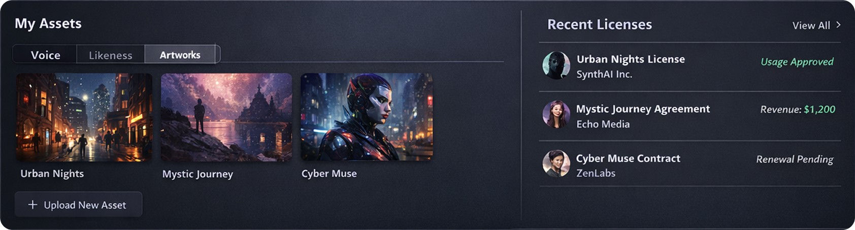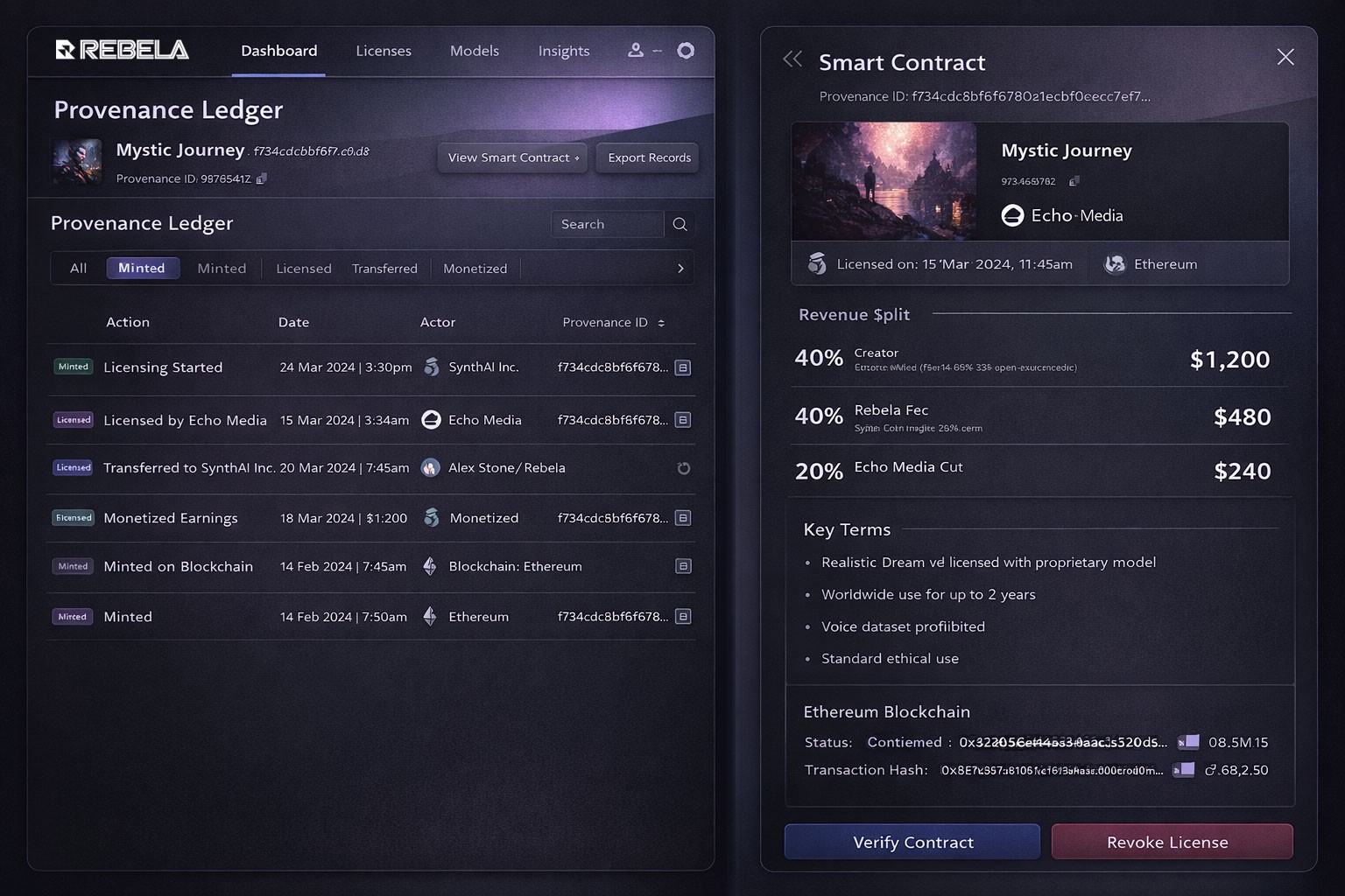Before an AI model renders a face or voice, it must request permission from the Rebela protocol. Licensing decisions happen in milliseconds, ensuring only authorized likenesses can be generated, by design, not by detection.
